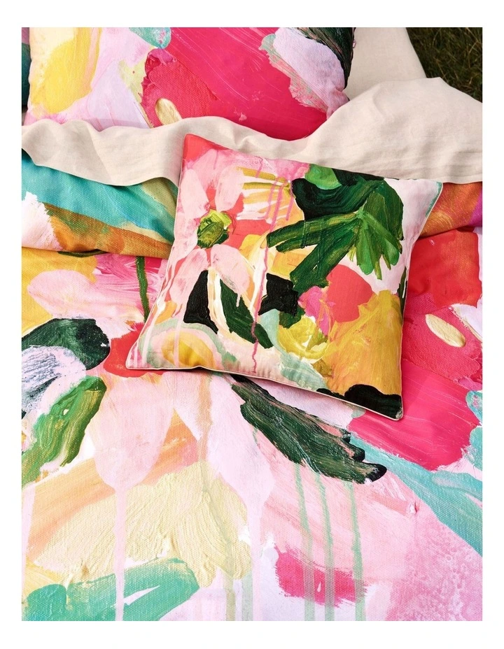 Euphoric and bursting with magnificent colour, this painted artwork is a delightful abstract expression printed on textured cotton slub with a cord piping trim.