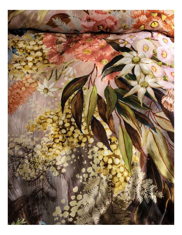 Using oil pastels and thick paint strokes, we’ve created waratahs, wattle and waxflowers with colourful flowering gum as well as gum leaves with delicate blossoms set against painterly pinks and browns.Â