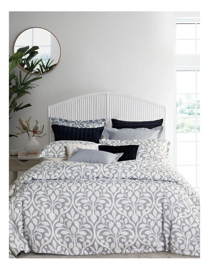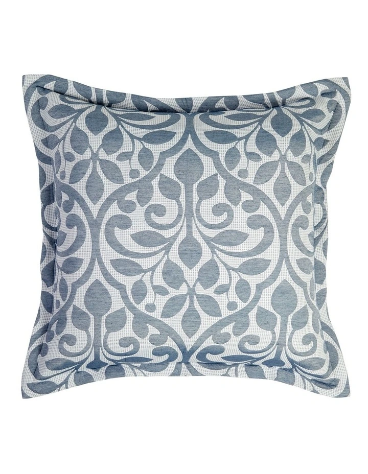 Marina Blue uses an interplay of patterns and textures to tell a story. Large scale floral emblems in chambray blue are lightly quilted for downy soft texture, set against a woven blue and white ground with subtle check pattern. Edges are neatly tailored with a self-flange.