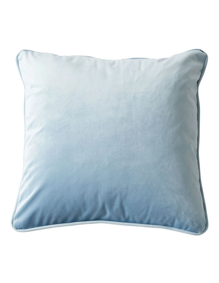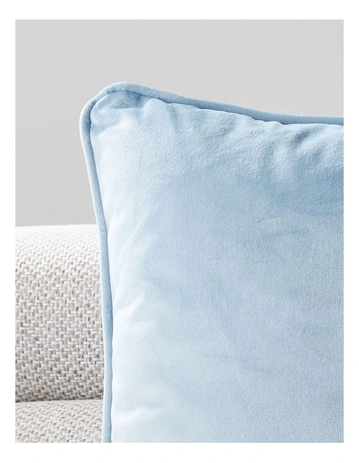 A luxe dusty blue velvet cushion featuring a polyester piped edging in an assortment of 8 lively colours.