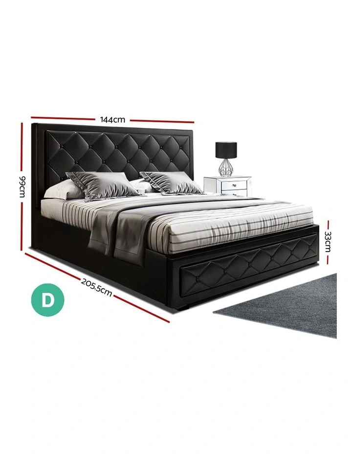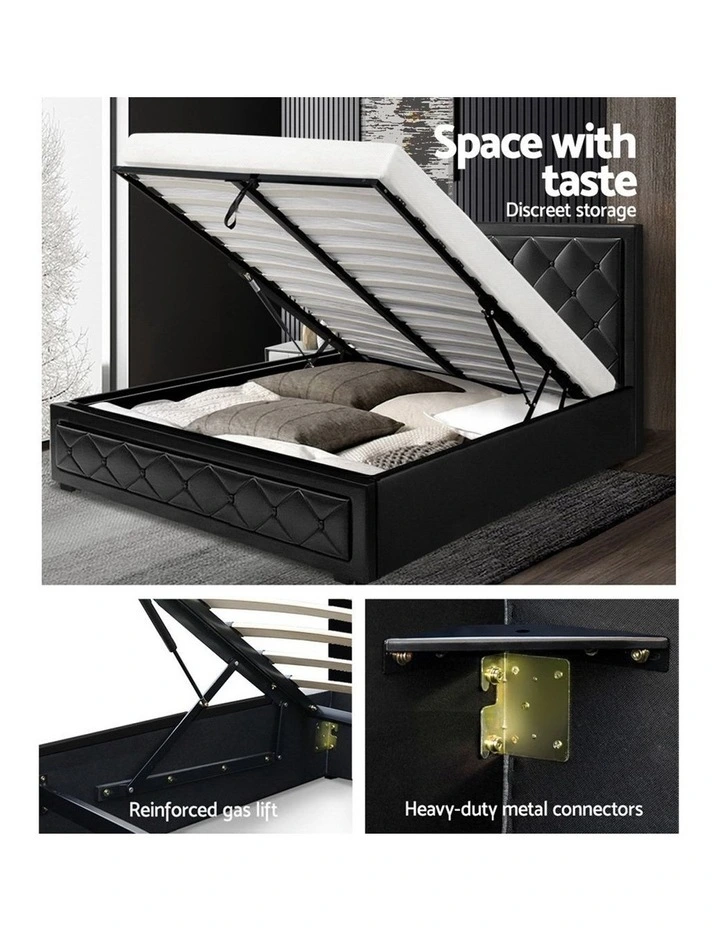 From the outside, our contemporary Artiss Tiyo Gas Lift Bed Frame looks absolutely plush. The premium PVC leather tufted headboard and sides all exudes fine craftsmanship. But there is more to this luxurious bed frame than meets the eye. Lift up the frame and you will find acres of storage space under the wooden arched slat base. The gas lift system and hand strap enable you to effortlessly lift the bed to store all your seasonal beddings and linen such as extra quilts, pillows and comforters and more. The wooden arched slat base is also designed to flex appropriately so that it can better distribute the weight exerted on it. Overall, the bed frame is well-built with reinforced steel bars within its sturdy steel frame. Heavy-duty metal connectors keep the frame sturdy with additional central support from an adjustable centre support beam. Enjoy your wonderful sleep in more ways than one with our innovative Tiyo Gas Lift Bed Frame.